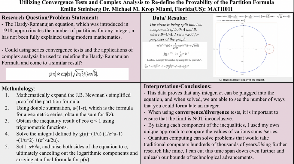 I worked closely with a professor from U.C. Berkeley to create an original research paper on the redefinition of the Partition Formula. By using complex analysis, I constructed a paper in OverLeaf (a mathematical based coding system) to identify a unique approach to this proof.